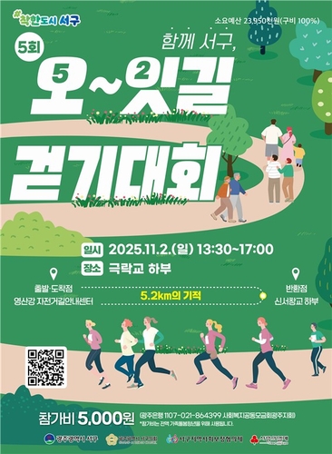 [박한용 기자]광주광역시 서구(구청장 김이강)는 11월2일 극락교 하부(서창둑길 377) 일대에서 '제5회 함께 서구, 오∼잇길 걷기대회'를 개최한다. '오잇길'은 '오(5)천원의 나눔으로 우리 이(2)웃의 희망을 잇는 5.2㎞의 길'이라는 의미로, 이번 대회는 가족돌봄청년을 지원하기 위해 열리는 서구 대표 주민참여형 나