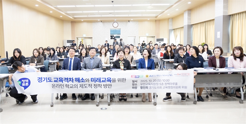 경기도의회 교육행정위원회 황진희 의원(더불어민주당, 부천4) 은 10월 20일(월) 오전 10시, 부천교육지원청 5층 청백마루홀에서 열린 「경기도 교육격차 해소와 미래교육을 위한 온라인학교의 제도적 정착 방안」 경기교육정책토론회의 좌장을 맡아 ‘경기온라인학교’의 제도적 기반 구축과 교육격차 해소 방안을 논의했다.