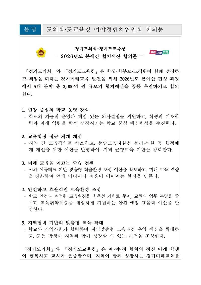 도의회·도교육청 여야정협치위원회는 ▲현장 중심의 학교 운영 강화, ▲교육행정 접근 체계 개선, ▲미래 교육을 이끄는 학습 전환, ▲안전하고 효율적인 교육환경 조성, ▲지역협력 기반의 맞춤형 교육 확대 등 5대 분야 2,000억원 규모의 협치예산을 공동 추진하기로 합의했다.