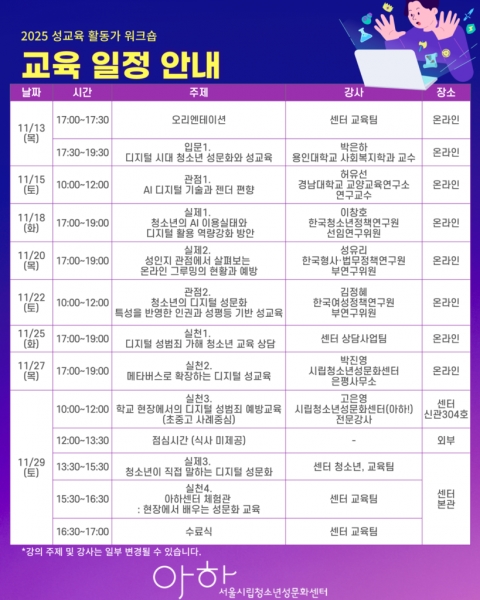 교육 일정은 △박은하(용인대 교수)의 ‘디지털 시대 청소년 성문화와 성교육’을 시작으로 △허유선(경남대 교수)의 ‘AI 디지털 기술과 젠더 편향’ △이창호(한국청소년정책연구원)의 ‘청소년의 AI 이용 실태와 역량 강화 방안’ △성유리(한국형사법무정책연구원)의 ‘온라인 그루밍 현황과 예방’ △김정혜(한국여성정책연구원)의 ‘인권과 성평등 기반 성교육’ △시립청소년성문화센터 상담사업팀의 ‘디지털 성범죄 가해 청소년 상담’ △박진영(은평사무소)의 ‘메타버스로 확장하는 성교육’ △시립청소년성문화센터 고은영 강사의 ‘학교 디지털 성범죄 예방교육’ 등으로 구성됐다.