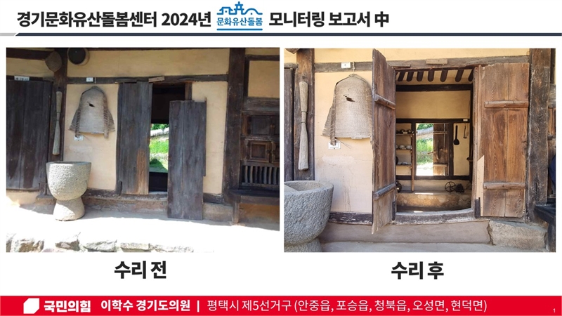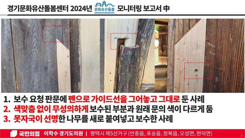 이학수 의원은 경기문화유산돌봄센터의 2024년 모니터링 보고서를 직접 분석하고 도내 시군 담당자 인터뷰를 통해 보수 부실 사례를 제시했다. 보고서와 현장 확인 결과, 문화유산 보수 요청 부위에 펜으로 가이드선을 그어둔 채 방치한 사례, 색 맞춤 없이 다른 색의 나무로 덧대어 수리한 사례, 못자국이 선명한 재활용 자재를 사용한 사례 등이 확인됐다. 이 의원은 “이 같은 행위는 문화유산 보수로 보기 어려운 수준의 관리 부실”이라고 강하게 비판했다.
