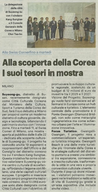 특히 이탈리아 북부 언론사인 IL GIORNO를 비롯해 10여 개 언론사에서 우리구의 팝업홍보관을 대서특필하는 등 이탈리아에서 수영구를 성공적으로 홍보하는 성과도 이루었다.