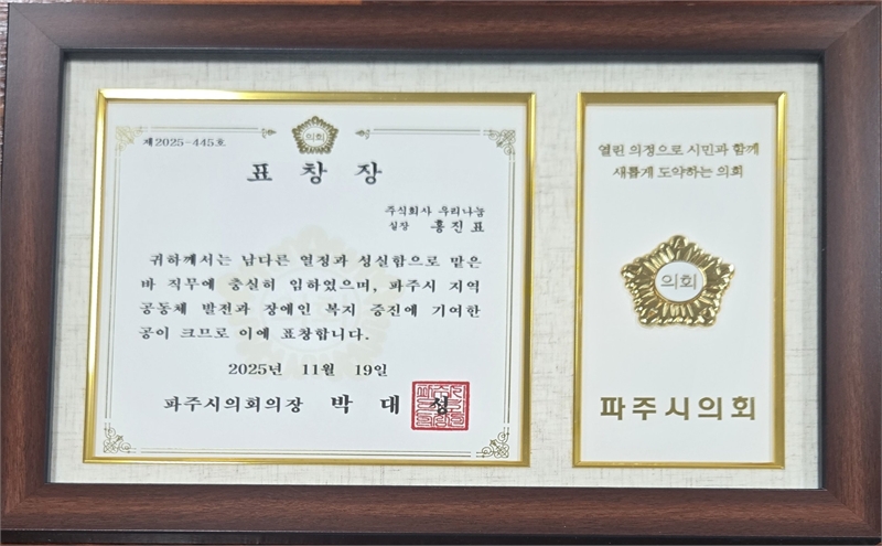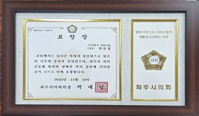 특히 협업기반의 일하는 방식 혁신으로 사회적 경제 활성화를 통한 사회통합을 위해 사회적 가치를 지향하는 지역사회 기관인 사회적기업 우리나눔과 사랑나눔행복한동행과 장애인공동생활가정이 수요자 중심의 실제적인 업무협약으로 사회적 약자들의 교육서비스를 공동으로 개발하고 사회적약자들의 교육 서비스를 공동으로 개발하고 사회적약자들의 취업지원을 위해 노력하였고, 취업이 최고의 복지라는 생각으로 일자리 창출을 위한 협업기반의 일하는 방식 혁신으로 모범적으로 운영한 결과로 2025년 11월 19일 파주시의장상을 수상한 것은 어떻게 보면 당연한 결과였을지도 모른다.