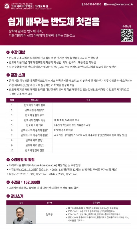 고려사이버대학교 미래교육원은 반도체 산업 전반에 대한 기초 이해를 돕는 교육 과정인 ‘쉽게 배우는 반도체 첫걸음’ 수강생을 모집한다고 밝혔다.